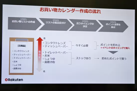 最後に、岡野氏も実践しているという「買い物カレンダー」の作成だ。「日用品を緊急度でリストアップして“今すぐ必要”なものはイベントのタイミングで購入、“ストックがある”ものは貯めたポイントで買うといった区分けをする。日用品はポイントを貯める上で最重要」。自分の買い物の傾向が分かれば、ポイントを貯める/使う戦略が立てやすくなるというわけだ。