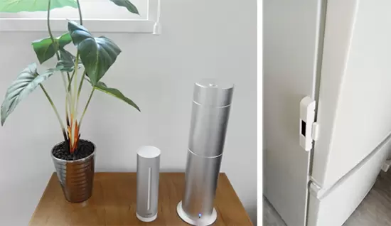(左から、アプリを通じて香りを放出する香りデバイス、冷蔵庫の扉の開閉回数をカウントする開閉センサ)