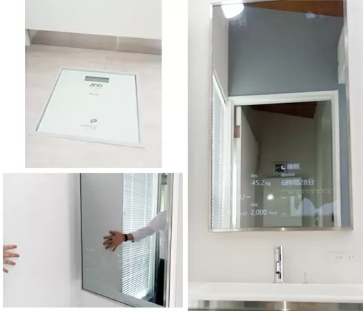 床に埋め込まれた体重計(左)で計測した前日の体重や睡眠解析データ、天気などを表示する鏡(右)。