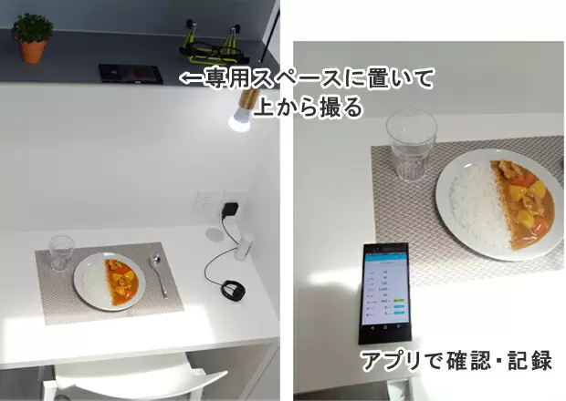 個人的に最も気になったのは、食卓の上の専用スペースにスマホを置き、食事の写真を撮るだけで、メニューに応じた摂取カロリーを推定して記録する「食事解析カメラ」。画像解析によって自動で、手間をかけずに、レコーディングダイエットに必要な情報を取得でき、食生活をコントロールできる。