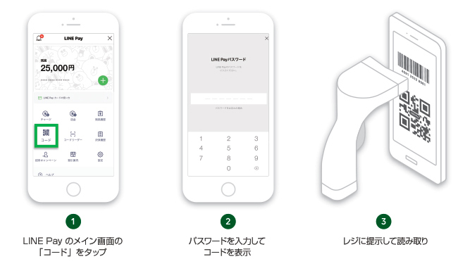 コード決済は、スマートフォンで「LINE」アプリを起動し、「…(その他)」タブ中央の「LINE Pay」から利用可能で、登録後チャージすることで「LINE Pay」導入店舗ならスマートフォンだけで買い物ができる。