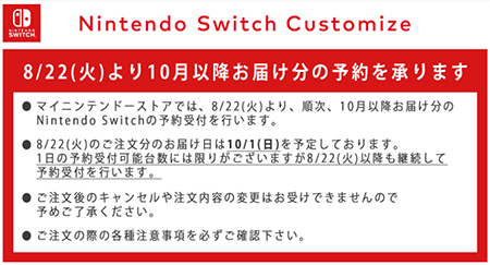 状況を重くみた任天堂は、6月22日に『「Nintendo Switch本体」品薄のお詫びとお知らせ』を同社のWebサイトへ掲載。秋以降に生産体制を強化する旨を告知した。8月22日からは任天堂の公式オンラインストア「マイニンテンドーストア」でも、10月以降に届くニンテンドースイッチの予約受付を開始した。時間はかかるが確実に入手できる方法として期待されたが、アクセスの集中で接続できない。ついには年の瀬に入る前から、「マイニンテンドーストア」での購入ではクリスマスプレゼントに間に合わない事態に陥った。