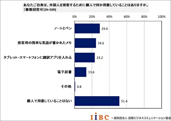 外国人を接客するために個人的に用意しているものをきくと、「個人で用意していることはない」が半数以上(51.4%)を占め、実際に用意しているものも「ノートとペン」(29.0%)、「接客用の簡単な英語が書かれたメモ」(24.6%)、「タブレット・スマートフォンに翻訳アプリを入れる(23.2%)」などに分散した。
