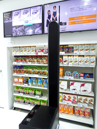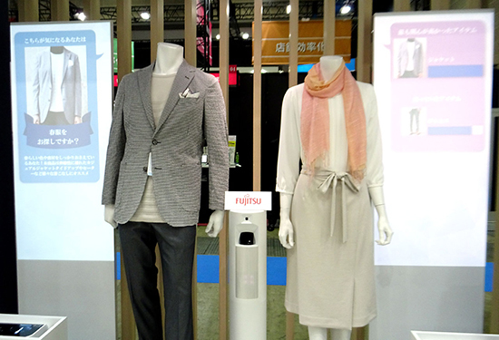 3月9日まで東京ビッグサイトで開催されている展示会「リテールテックJAPAN 2018」で、同技術のデモンストレーションが行われた。男女の衣服を着せたマネキンを顧客が10秒間注視すると、顧客がとくに関心をもっているアイテムや関連する商品・サービスをデジタルサイネージに表示する。視線と同時に性別や年齢層などの顧客属性も分析し、男性客がレディース商品に関心をもっていた場合は、プレゼント需要を見込んだ商品提案などを行う。