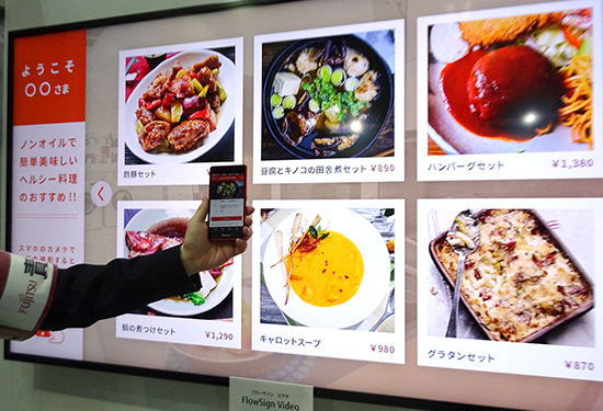そのほか、リテールテックJAPANの富士通ブースでは、デジタルサイネージの動画にURLなどの情報を埋め込む技術も紹介。サイネージ画面に表示された商品を、顧客がスマートフォンのカメラで読み取ると、当該商品が販売されているECサイトが表示される。家電量販店の調理家電売り場に置いたサイネージ画面で、材料の食材を販売するといったシナリオを提案している。
