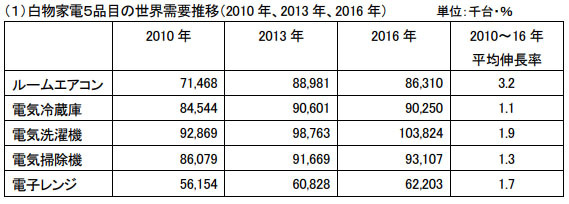2010年・13年・16年の白物家電5品目の世界需要推移と2010~16年の平均伸長率