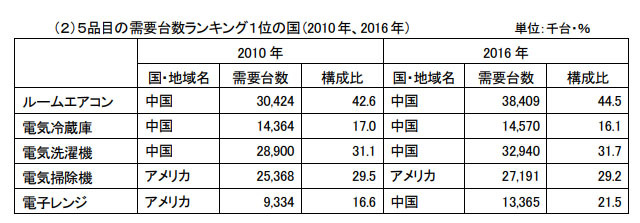対象品目は、ルームエアコン、冷蔵庫、洗濯機、掃除機、電子レンジの5品目で、対象期間は2010~16年(1~12月ベース)。16年の需要をみると、アメリカが1位となった掃除機以外は中国が1位で、特にエアコンは、中国だけで4割以上を占める。