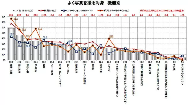 さらに、写真を撮影する際、デジカメしか使わない層(デジカメのみの層)とスマホしか使わない層(スマホのみの層)に分け、被写体の傾向や、撮影の動機などを聞いた。デジカメのみの層が最もよく撮るのは「風景・夜景」が1位で76.3%、「花・植物」(2位、57.9%)、「国内旅行」(3位、56.6%)と続く。スマホのみの層でも1位と3位は「風景・夜景」(43.3%)と「国内旅行」(32.9%)と同じだが、SNSなどへの掲載が多いためか、2位は「料理」(36.3%)で、カメラのみの層と大きく違う結果になった。