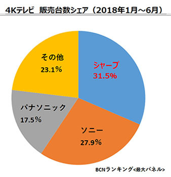 全国の主要家電量販店・ネットショップの実売データを集計した「BCNランキング」によると、2018年上半期(1月1日~6月30日)の4Kテレビのメーカー別販売台数シェアでNo.1を獲得したのは、シャープで31.5%だった。2位はソニーで27.9%、3位はパナソニックで17.5%だった。