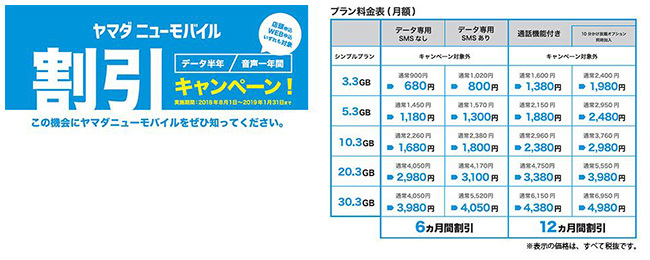 USEN-NEXT HOLDINGSとヤマダ電機の合弁会社であるY.U-mobileは、ヤマダ電機ブランドのMVNOサービス「ヤマダニューモバイル」で「データ半年間・音声一年間割引キャンペーン」の実施を8月1日に開始した。