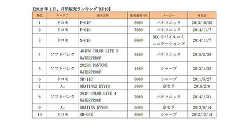 携帯電話全般の買取・販売を行う携帯市場は、2019年1月1~31日の自社による中古ガラケー・フィーチャーフォン販売のトップ10を発表した。12カ月連続で1位を確保していた「202SH」を抜いて、「P-01F」がトップになったという。