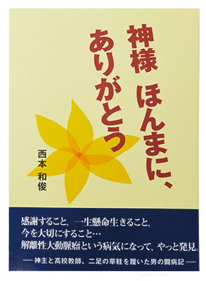 2007年に記された西本宮司の闘病記『神様 ほんまに、ありがとう』。写真は三ツ山大祭礼の折り、祝詞を奏上していた時のもの。撮影された方の文章に神様への畏怖と信仰がうかがえる。「この二つが今の僕を支えてくれています」とのことだ。