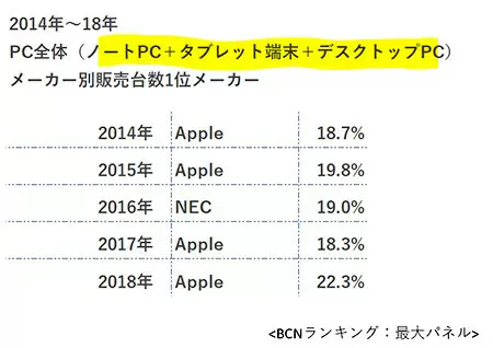 日本の個人向けPC市場は、ハードとOSを一貫して手掛け、独自路線を貫くAppleの存在感も大きい。「BCNランキング」によると、Appleは、15年、17年、18年と、タブレットを含むPC全体の年間販売台数1位を獲得。最新版は18年9月配信開始の「macOS Mojave」となるmacOSは、iOSのアプリや連携機能を取り入れ、進化している。