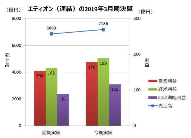 エディオンが5月9日に発表した2019年3月期の連結決算は、増収増益となり好調だった。売上高は7186億3800万円(前期比4.7%増)、営業利益は178億4200万円(16.0%増)、経常利益は188億8900万円(16.8%増)、親会社株主に帰属する当期純利益は116億4200万円(30.2%増)だった。