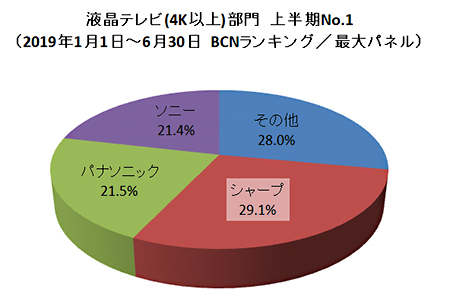 全国の主要家電量販店・ネットショップのPOSデータを集計した「BCNランキング」の液晶テレビ(4K以上)部門(有機ELテレビ含まず)で、2019年1月1日~6月30日の販売台数シェアNo.1を獲得したのは、シャープだった。シャープは2018年の年間販売台数シェアでも29.5%のトップを獲得しており、好調をキープしている。
