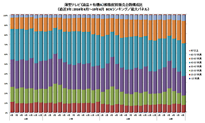 19年6月のデータでは大画面化をけん引しているは、40インチ台ではなく50インチ以上。3年前よりも14.7ポイントもアップしている。一方で、かつての売れ筋だった30インチ台は20.0%と3年前から8.1ポイントダウンした。このことからも、メインテレビだけではなくセカンドテレビでも大画面化のリプレースが進んでいると考えられる。