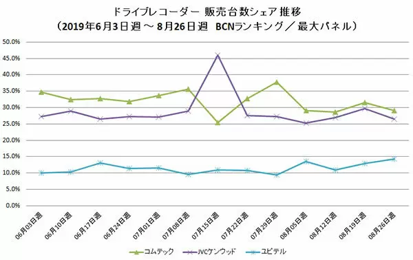 8月週次のメーカー別販売台数シェアでは、1カ月を通してコムテックが首位をキープ。2番手のJVCケンウッドもぴったりと5ポイント差内でコムテックを追っている。3番手のユピテルも15%近くまでシェアを上げ、市場をけん引するツートップを射程に捉えている。