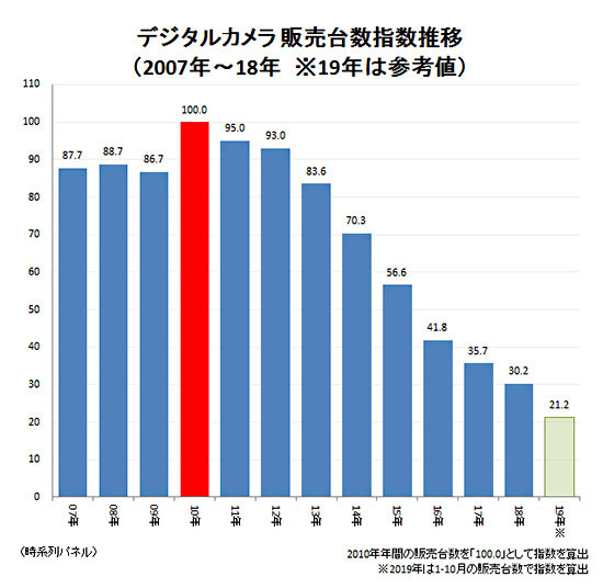 さらに細かくデータを見てみると、最も販売台数が多かった10年の販売台数を100.0とした際、18年の市場規模は30.2まで落ち込んでいる。19年は、10月までで21.2になっている。30.0を超えることはなさそうだ。カメラ映像機器工業会のデジタルカメラ統計でも、出荷台数が1億2146万3234台(10年)から1942万3371台(18年)へと減少し、約16.0%規模にまで落ち込んでいる。