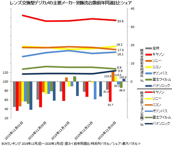 BCNランキングで19年12月2日~20年1月5日までの5週間、レンズ交換型デジカメの主要メーカー別販売台数シェアや販売台数同週比を集計した。12月2日週(12月2~8日)では、レンズ交換型デジカメの販売台数が前年同週比44.4%と大きな落ち込みを示した。