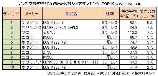 ボディ・レンズキットを合算した製品別の販売台数ランキングでは、上位3機種がミラーレスで、4位以下に一眼レフが4機種ランクインした。レンズ交換型デジカメ全体の平均単価は、すでにミラーレスが一眼レフを上回っている状況だが、個別のランキングでも「単価高めのミラーレス」対「手頃な価格の一眼レフ」という構図が見て取れる。