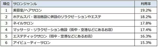 日本で利用したことがある美容関連のお店・サービスを尋ねた質問では、「美容室/ヘアサロン」(19.2%)、「ホテルスパ・宿泊施設に併設のリラクゼーションやエステ」(18.2%)が上位となっている。