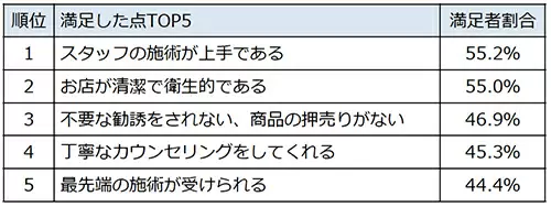 直近の日本旅行で、美容関連サービスを利用した旅行者のほぼ全員がサービスに「満足した」と答えており、満足した点としては「施術が上手」「清潔で衛生的」が上位を占めた。