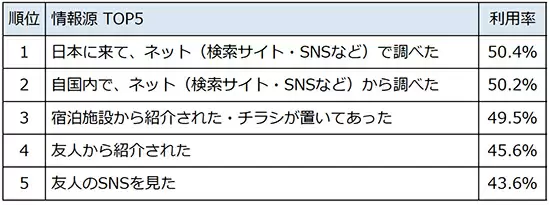 直近の日本旅行で利用した美容関連のお店・サービスの情報源は、「日本に来てネットで調べた」「自国内で事前にネットで調べた」「宿泊施設の紹介・チラシ」が5割に達している。