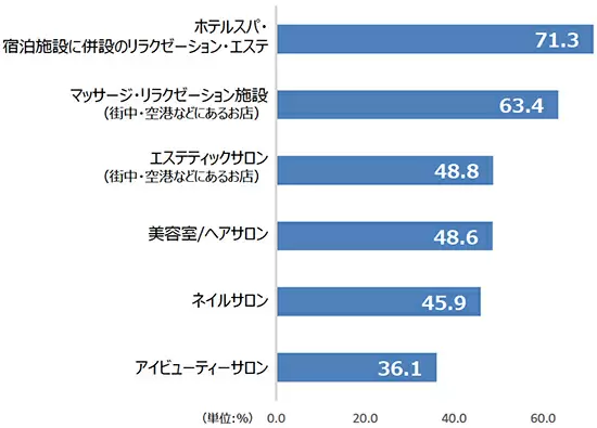 今後の、日本での美容関連のお店・サービスの利用意向については、「ホテルスパ・宿泊施設に併設のリラクゼーション・エステ」が最も多い。
