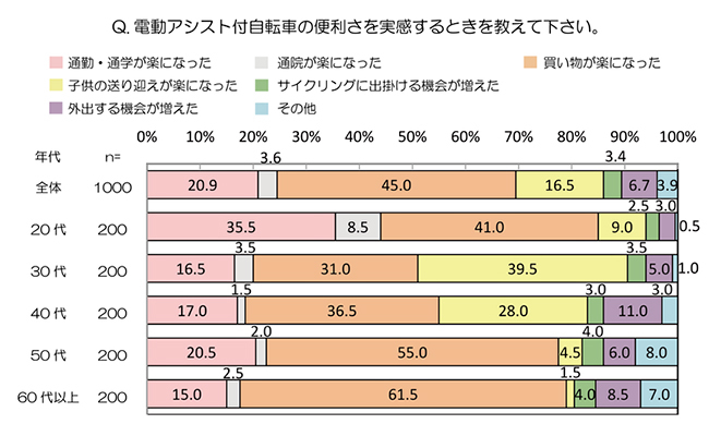 電動アシスト付自転車の保有者(1000人)に「電動アシスト付自転車の便利さを実感するとき」を尋ねたところ、「買い物が楽になった」が最も高く45.0%。次いで「通勤・通学が楽になった」が20.9%、「子供の送り迎えが楽になった」が16.5%という。20代で「通勤・通学が楽になった」(35.5%)が全体平均よりも高く、30代で「子供の送り迎えが楽になった」(39.5%)が最も高いとのことだ。