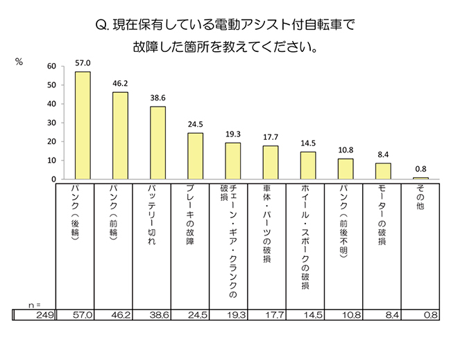 また、電動アシスト付自転車の保有者に故障経験の有無を尋ねたところ、24.9%が故障を経験していると答えたという。故障の内訳を尋ねると(複数回答可)、後輪のパンクが57.0%で1位、次いで前輪のパンクが46.2%、バッテリ切れが38.6%、ブレーキの故障が24.5%、チェーン・ギア・クランクの破損が19.3%とのことだ。