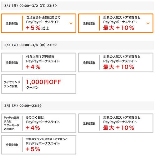 「決算 ワイ!ワイ!SALE」では、「Yahoo!ショッピング」および「PayPayモール」内の対象ストアで買い物をすると、通常のTポイントやPayPayボーナスなどに加えて、決済金額の10%もしくは5%のPayPayボーナスライトが付与される。付与上限は10%の場合は1万円相当、5%の場合は5000円相当。