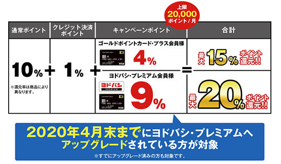 期間中にヨドバシカメラの各店舗で会員カード「ゴールドポイントカード・プラス」のクレジットカード決済で買い物をすると、現金購入の場合と同率の通常ポイント(商品により10%)に、5%(クレジット決済ポイント1%+キャンペーンポイント4%)が加わり最大15%のポイント還元となる。