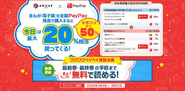ebookjapanでは、毎週金曜日に、Yahoo!プレミアム会員であれば最大20%、ソフトバンクもしくはワイモバイルスマホユーザーであれば最大30%のPayPayボーナスが付与されるキャンペーンを実施している。今回の「ebookjapan 3月は毎日最大20%戻ってくる!」キャンペーンと組み合わせることで、期間中の金曜日(3月20日、3月27日)に対象の顧客がPayPay残高で支払うと、Yahoo!プレミアム会員であれば最大40%が、ソフトバンクもしくはワイモバイルスマホユーザーであれば最大50%が付与される。