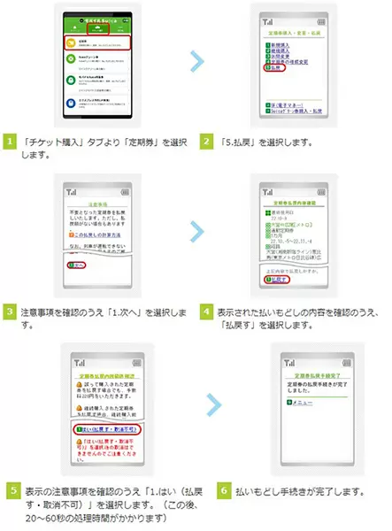 もし、今の新型コロナウイルス感染症が完全に鎮静化するまで、基本的に出社しない、完全リモートワークの指示が出ているなら、通勤定期の払い戻しを検討したい。他社線との連絡定期券を含むJR東日本線の「モバイルSuica定期券」の場合、スマホからいつでも簡単に払い戻し可能。利用開始前なら220円の払い戻し手数料だけで全額、利用開始後は、有効期間が1カ月以上残っている場合に同じく220円の払い戻し手数料を支払うと所定の計算式に沿って返金される。