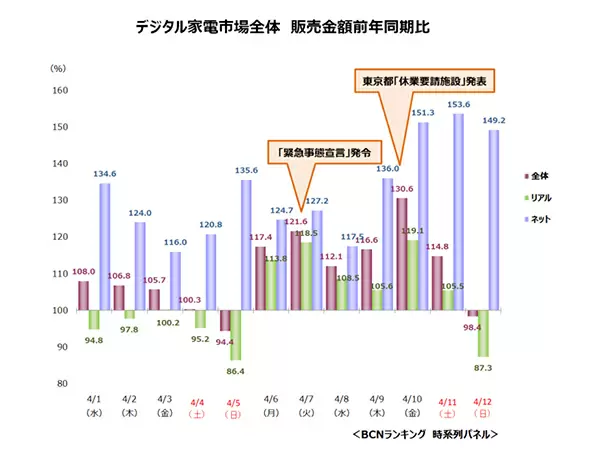 BCNランキングの別のデータから見てみよう。デジタル家電市場全体の販売金額で、4月第2週(4月6~12日)の日次データを確認すると、4月7日の緊急事態宣言の発令でリアル店舗(118.5%)とネット(127.2%)の売り上げが急増し、東京都が休業要請施設を発表した翌日の4月11日はリアル店舗(105.5%)は減っているものの、ネット(153.6%)の売り上げが高水準に増えていることが分かる。