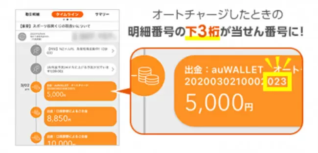 今回のキャンペーンでは、期間中にau PAY残高のチャージ方法としてauじぶん銀行からのオートチャージ設定を行うことで、オートチャージ利用のたびに自動的に抽選の対象となる。オートチャージした際の取引明細番号下3ケタが抽選番号となるため、顧客は、auじぶん銀行スマートフォン(スマホ)アプリのタイムライン上で、利用後すぐに抽選結果を確認できる。抽選番号が「023」または「903」の場合、当選となる。