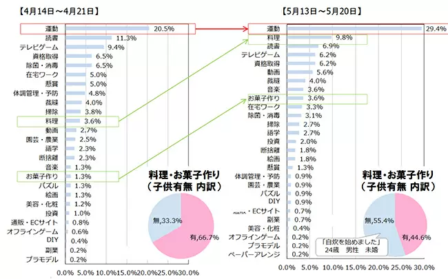 始めたコトでは「運動」「料理」「お菓子作り」が増加