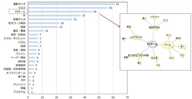 TVゲームでは、Nintendo Switchや、「リングフィットアドベンチャー」「あつまれどうぶつの森」を購入した、という回答がみられた。