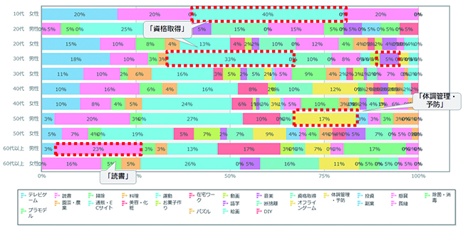 性年代別では、10代女性と30代男性で「資格取得」の割合が高く、50代男性では「体調管理・予防」、60代男性で「読書」が他の層よりも多かった。