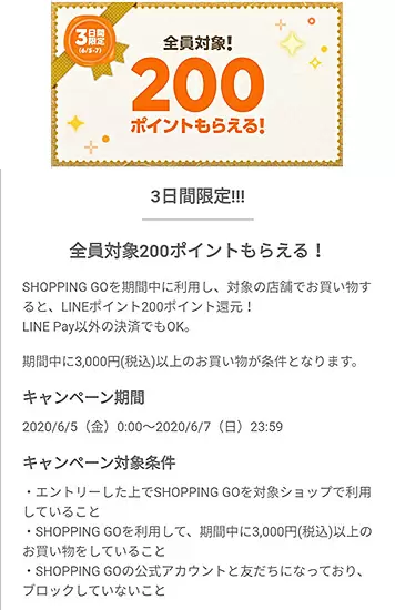 LINEは、対象店舗で「SHOPPING GO」を利用して税込み3000円以上購入すると、通常付与ポイントに加え、もれなくLINEポイント200ポイントを還元する「3日間限定!!! 全員対象200ポイントもらえる!」キャンペーンを実施する。キャンペーン期間は、2020年6月5日0時~6月7日23時59分。