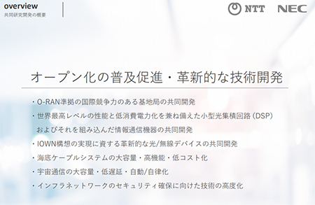 両社による共同技術開発の具体的な中身は次の六つ。(1)O-RAN準拠の国際競争力のある基地局、(2)世界最高レベルの性能と低消費電力化を兼ね備えた小型光集積回路(DSP)と、それを組み込んだ情報通信機器、(3)IOWN(Innovative Optical and Wireless Network)構想の実現に資する革新的な光/無線デバイス、(4)海底ケーブルシステムの大容量・高機能・低コスト化、(5)宇宙通信の大容量・低遅延・自動/自律化、(6)インフラネットワークのセキュリティ確保に向けた技術の高度化――。