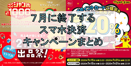 マイナポイント事業の申し込みが開始され、再びキャンペーンの応酬になっているスマートフォン決済サービス。マイナポイント事業にかかわるものについては9月からが本番だが、それ以外のキャンペーンについても多数展開されている。7月末をもって終了するものも多いので、今のうちに確認しておきたい。