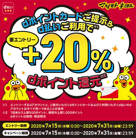d払いは7月15日から「マツモトキヨシd払い+20%還元キャンペーン」を実施中。キャンペーンサイトでエントリーの上、dポイントカードを提示して、d払いで支払うと、通常付与するポイントに加え、購入金額の20%相当のボーナスポイントを付与する。上限は500ポイント/回、1000ポイント/期間。