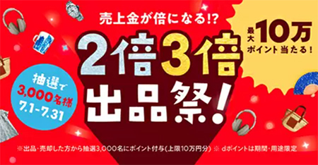 さらに、当選者がメルカリアカウントと「dアカウント」の連携が完了していると、対象商品の「売上金」総額分のメルカリポイントの代わりに、対象商品の「売上金」総額の2倍分のdポイント(期間・用途限定)を付与し、売上金は実質3倍になる。付与するポイントの上限は1人10万円相当で、当選人数は3000人。