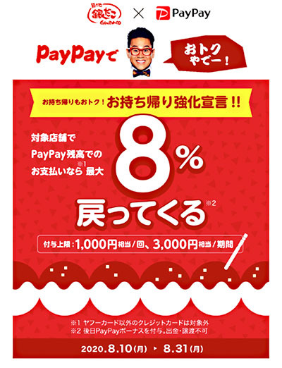 このキャンペーンは、「いつでもどこでもワクワクペイペイ」の8月施策として開催するもの。対象の「築地銀だこ」の店舗で、PayPay残高やYahoo! JAPANカード、PayPayあと払い(一括のみ)で支払うと、最大8%のPayPayボーナスが付与される。