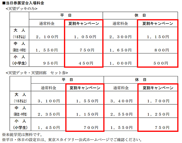 天望デッキのみの料金は、平日の大人(18歳以上)が通常2100円のところ1050円に、中人(高校・中学生)が通常1550円のところ750円に、小人(小学生)が通常950円のところ450円となる。ほかにも、休日や天望デッキと天望回廊のセット券などで料金は異なるが、全て半額の夏割キャンペーン価格が適用される。