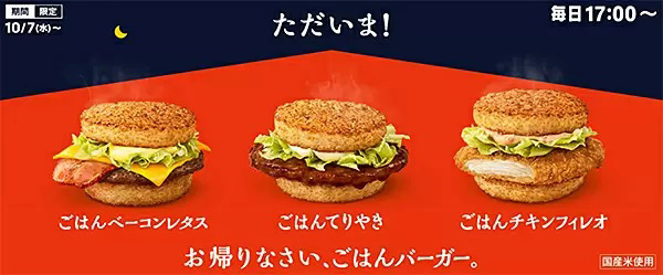 日本マクドナルドは、10月7日から期間限定で「ごはんバーガー」を復活させている。メニューは以前と同様、「ごはんてりやき」「ごはんベーコンレタス」「ごはんチキンフィレオ」の3種。毎日17時からの夜マックメニューとして提供する。復活に伴って、Twitterキャンペーンも実施する。