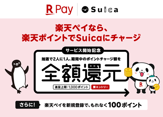 なお、サービス開始を記念して12月9日から2021年1月31日まで、「楽天ポイントからSuicaへのポイントチャージで2人に1人全額還元キャンペーン!」を実施。期間中、楽天ペイのキャンペーンページでエントリーして、楽天ペイアプリで楽天ポイントからSuicaにチャージすれば、2人のうち1人にポイントチャージ分に対して全額が楽天ポイントで還元される(上限1000ポイントまで)。