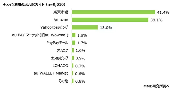 調査対象者のうち、総合ECサイトを利用したことがある人(9010人)に、メインで利用している総合ECサイトを尋ねた質問では、楽天市場(41.4%)が最多で、以下、Amazon(38.1%)、Yahoo!ショッピング(13.0%)が続いている。