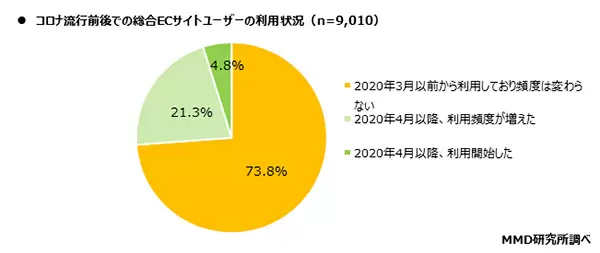 同じく、総合ECサイトを利用したことがある人に、新型コロナウイルス感染症の流行前後での総合ECサイトの利用状況を尋ねたところ、「2020年4月以降、利用頻度が増えた」利用者が21.3%、「2020年4月以降、利用開始した」利用者が4.8%だった。